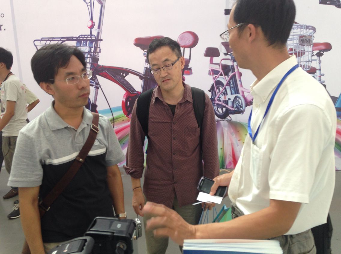 OE营销总监吴杰在公司产品展区现场与新大洲本田公司电动车开发经理成林聪和鲁志军进行交流